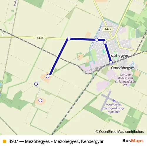 The first stop of the 4907 bus route is Mezőhegyes, vasútállomás and the last stop is Mezőhegyes, Kendergyár. 4907 (Mezőhegyes - Mezőhegyes, Kendergyár) is operational during everyday.