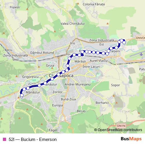 The first stop of the 52l bus route is Disp. Bucium and the last stop is Emerson Sosire. 52l (Bucium - Emerson) is operational during on weekdays.
