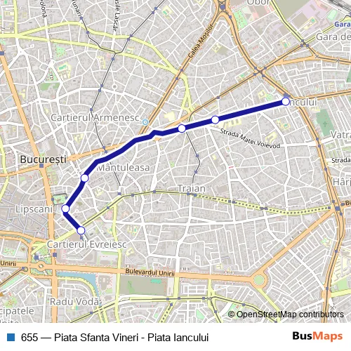 The first stop of the 655 bus route is Piata Iancului and the last stop is Piata Sfanta Vineri. 655 (Piata Sfanta Vineri - Piata Iancului) is operational during everyday.