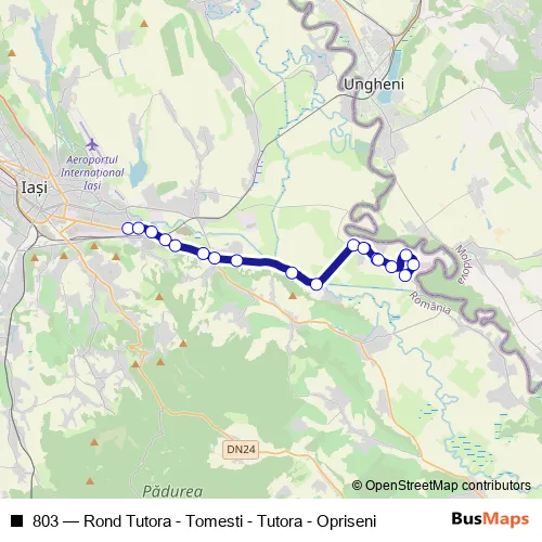 The first stop of the 803 bus route is Țuțora and the last stop is Str. Principala - Opriseni. 803 (Rond Tutora - Tomesti - Tutora - Opriseni) is operational during everyday.