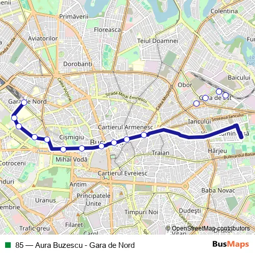 The first stop of the 85 trolleybus route is Gara de Nord and the last stop is Aura Buzescu. 85 (Aura Buzescu - Gara de Nord) is operational during everyday.