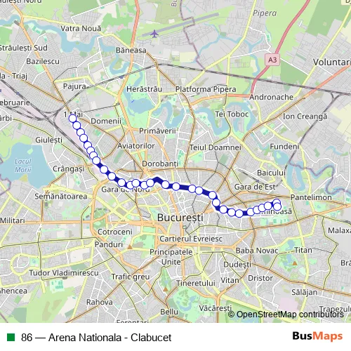 The first stop of the 86 trolleybus route is Clabucet and the last stop is Arena Nationala. 86 (Arena Nationala - Clabucet) is operational during everyday.
