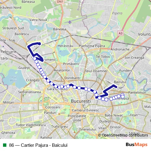 The first stop of the 86 trolleybus route is Baicului and the last stop is Cartier Pajura. 86 (Cartier Pajura - Baicului) is operational during everyday.