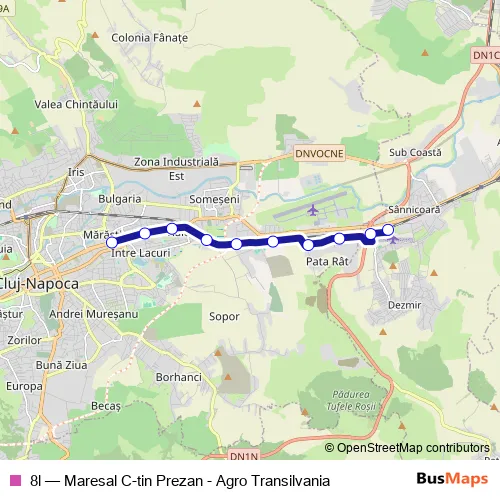 The first stop of the 8l bus route is Mareșal C-tin Prezan and the last stop is Piața Agro Sosire. 8l (Maresal C-tin Prezan - Agro Transilvania) is operational during on weekdays.