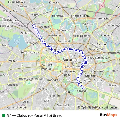 The first stop of the 97 trolleybus route is Pasaj Mihai Bravu and the last stop is Clabucet. 97 (Clabucet - Pasaj Mihai Bravu) is operational during everyday.