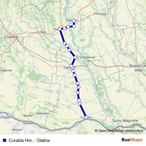 The first stop of the Corabia Hm. - Slatina rail route is Corabia Hm. and the last stop is Slatina. Corabia Hm. - Slatina (Corabia Hm. - Slatina) is operational during on weekdays.