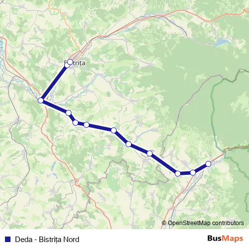 The first stop of the Deda - Bistriţa Nord rail route is Deda and the last stop is Bistriţa Nord. Deda - Bistriţa Nord (Deda - Bistriţa Nord) is operational during everyday.