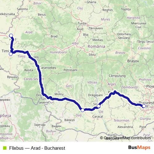 The first stop of the Flixbus bus route is Bucharest Militari Bus Station and the last stop is Craiova Pelendava Bus Station. Flixbus (Arad - Bucharest) is operational during everyday.