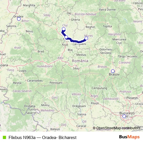 The first stop of the Flixbus N963a bus route is Oradea (Autogara Intrans) and the last stop is