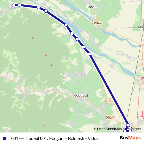 The first stop of the T001 bus route is Autogara Focşani and the last stop is Vidra. T001 (Traseul 001: Focşani - Boloteşti - Vidra) is operational during everyday.