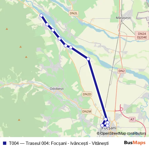 The first stop of the T004 bus route is Vitanesti and the last stop is Autogara Focşani. T004 (Traseul 004: Focşani - Ivănceşti - Vităneşti) is operational during everyday.