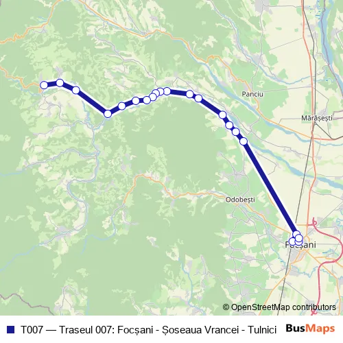 The first stop of the T007 bus route is Autogara Focşani and the last stop is Tulnici. T007 (Traseul 007: Focşani - Şoseaua Vrancei - Tulnici) is operational during everyday.