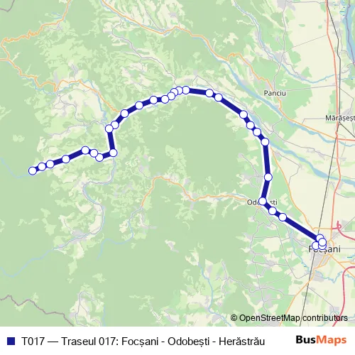 The first stop of the T017 bus route is Autogara Focşani and the last stop is Bradetu. T017 (Traseul 017: Focşani - Odobeşti - Herăstrău) is operational during everyday.