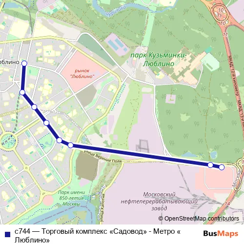 The first stop of the с744 bus route is Метро «Люблино» and the last stop is Торговый комплекс «Садовод». с744 (Торговый комплекс «Садовод» - Метро «Люблино») is operational during on weekdays.