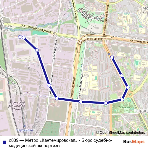 The first stop of the с839 bus route is Бюро судебно-медицинской экспертизы and the last stop is Метро «Кантемировская». с839 (Метро «Кантемировская» - Бюро судебно-медицинской экспертизы) is operational during everyday.