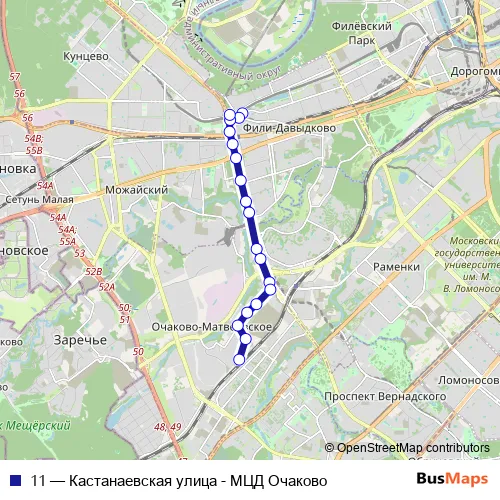 The first stop of the 11 bus route is Кастанаевская улица and the last stop is МЦД Очаково. 11 (Кастанаевская улица - МЦД Очаково) is operational during on weekends.