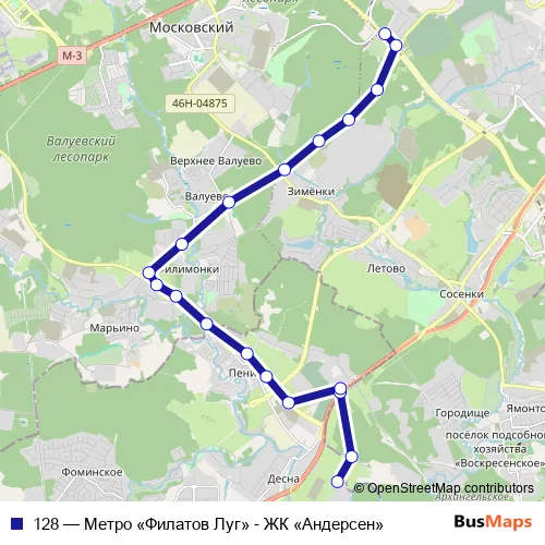 The first stop of the 128 bus route is ЖК «Андерсен» and the last stop is Метро «Филатов Луг». 128 (Метро «Филатов Луг» - ЖК «Андерсен») is operational during everyday.