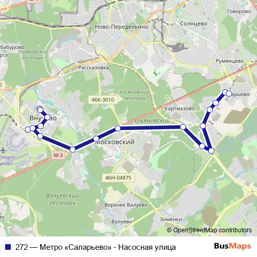 The first stop of the 272 bus route is Насосная улица and the last stop is Метро «Саларьево». 272 (Метро «Саларьево» - Насосная улица) is operational during everyday.