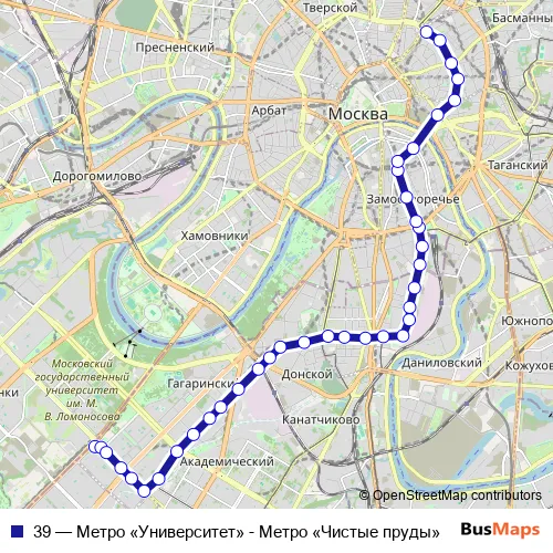The first stop of the 39 tram route is Метро «Университет» and the last stop is Метро «Чистые пруды». 39 (Метро «Университет» - Метро «Чистые пруды») is operational during everyday.