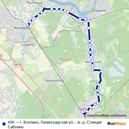 Bus 438 - г. Колпино, Ленинградская ул. - ж.-д. Станция Саблино in Nikol'skoye: Stops & Timetable