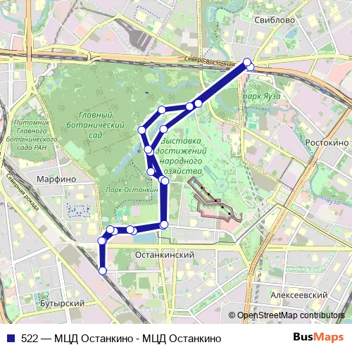 The first stop of the 522 bus route is МЦД Останкино and the last stop is МЦД Останкино. 522 (МЦД Останкино - МЦД Останкино) is operational during everyday.