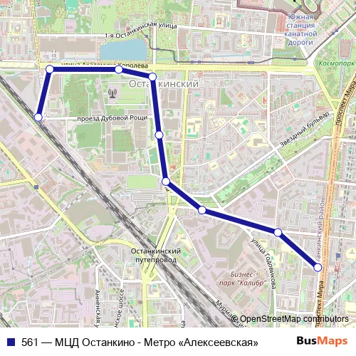 The first stop of the 561 bus route is МЦД Останкино and the last stop is Метро «Алексеевская». 561 (МЦД Останкино - Метро «Алексеевская») is operational during everyday.