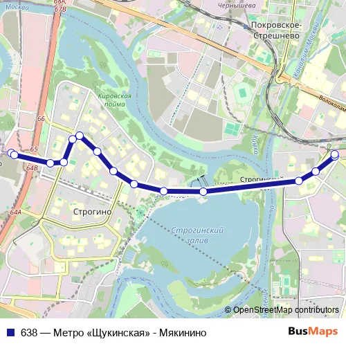 The first stop of the 638 bus route is Мякинино and the last stop is Метро «Щукинская». 638 (Метро «Щукинская» - Мякинино) is operational during on weekdays.