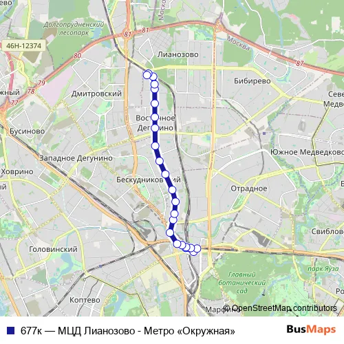The first stop of the 677к bus route is Метро «Окружная» and the last stop is МЦД Лианозово. 677к (МЦД Лианозово - Метро «Окружная») is operational during everyday.