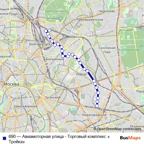 The first stop of the 690 bus route is Торговый комплекс «Тройка» and the last stop is Авиамоторная улица. 690 (Авиамоторная улица - Торговый комплекс «Тройка») is operational during everyday.