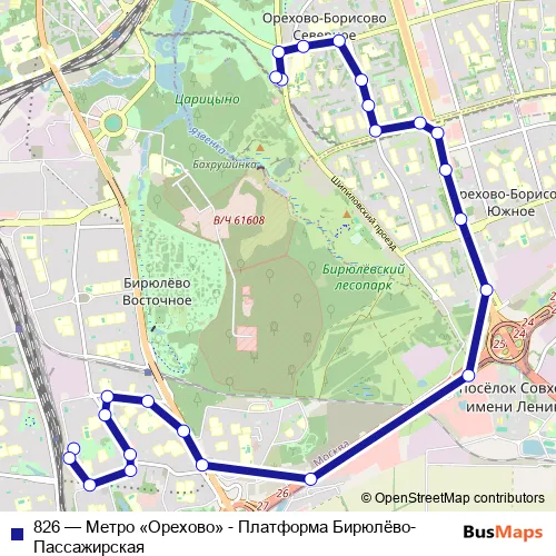 The first stop of the 826 bus route is Платформа Бирюлёво-Пассажирская and the last stop is Метро «Орехово». 826 (Метро «Орехово» - Платформа Бирюлёво-Пассажирская) is operational during on weekends.