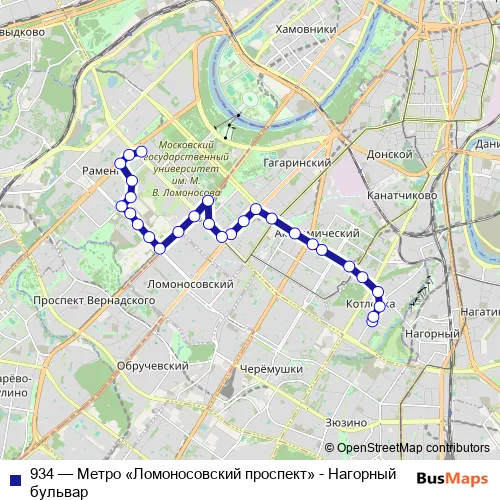 Click here to view the nearest 934 - Метро «Ломоносовский проспект» - Нагорный бульвар bus stop.