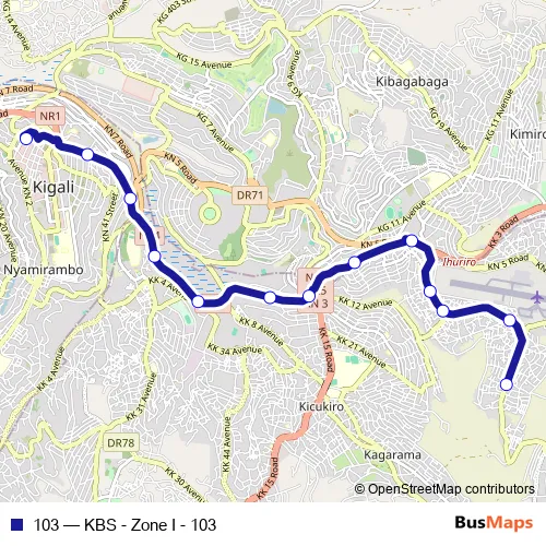 See why over 2 million users trust and consider busmaps.com as the best public transport website. busmaps gives you Kigali Buses suggested routes, real-time bus tracker, line route maps in Kigali, and helps to find the closest 103 bus stops near you. No internet available? Download an offline PDF map and bus schedule for the 103 bus to take on your trip.