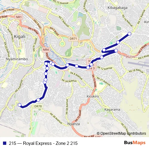 See why over 2 million users trust and consider busmaps.com as the best public transport website. busmaps gives you Kigali Buses suggested routes, real-time bus tracker, line route maps in Kigali, and helps to find the closest 215 bus stops near you. No internet available? Download an offline PDF map and bus schedule for the 215 bus to take on your trip.