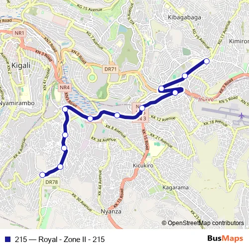 See why over 2 million users trust and consider busmaps.com as the best public transport website. busmaps gives you Kigali Buses suggested routes, real-time bus tracker, line route maps in Kigali, and helps to find the closest 215 bus stops near you. No internet available? Download an offline PDF map and bus schedule for the 215 bus to take on your trip.
