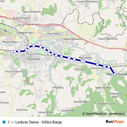The first stop of the 1 bus route is Niška Banja ( ka centru ) and the last stop is Ledena Stena (od centra). 1 (Ledena Stena - Niška Banja) is operational during everyday.
