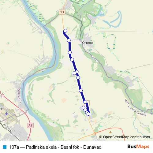 The first stop of the 107a bus route is Padinska skela and the last stop is Dunavac. 107a (Padinska skela - Besni fok - Dunavac) is operational during on weekdays.