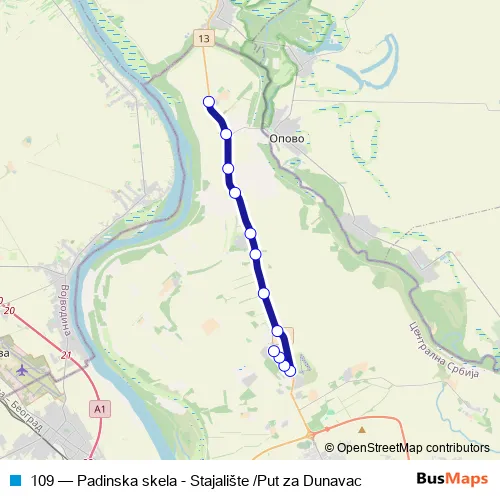 The first stop of the 109 bus route is Put za Dunavac and the last stop is Padinska skela. 109 (Padinska skela - Stajalište /Put za Dunavac) is operational during everyday.