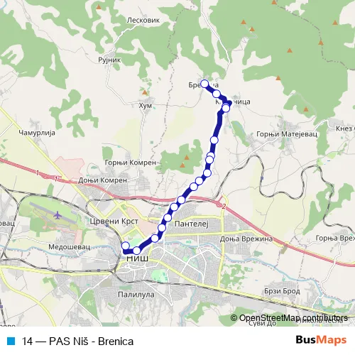 The first stop of the 14 bus route is Brenica (okretnica) and the last stop is Autobuska stanica ( od centra). 14 (PAS Niš - Brenica) is operational during everyday.