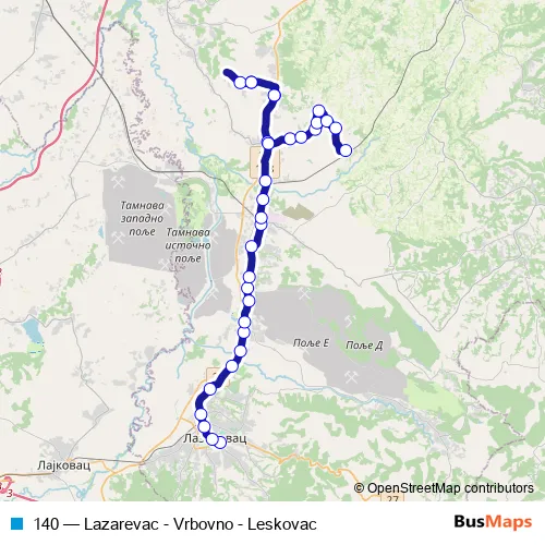 The first stop of the 140 bus route is Lazarevac As and the last stop is Leskovac - Crkva. 140 (Lazarevac - Vrbovno - Leskovac) is operational during everyday.