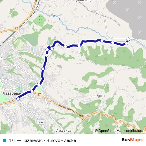 The first stop of the 171 bus route is Lazarevac As and the last stop is Zeoke. 171 (Lazarevac - Burovo - Zeoke) is operational during everyday.