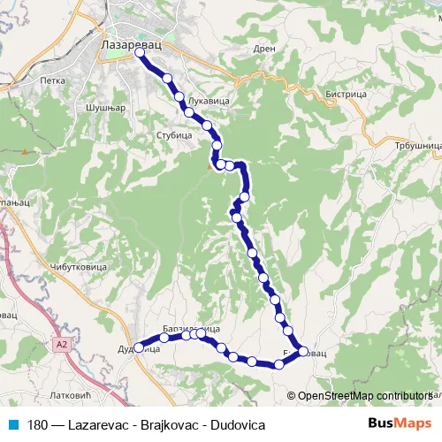 The first stop of the 180 bus route is Dudovica okretnica and the last stop is Lazarevac As. 180 (Lazarevac - Brajkovac - Dudovica) is operational during everyday.