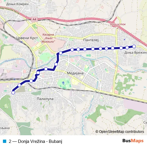 The first stop of the 2 bus route is Donja Vrežina ( ka centru ) and the last stop is Bubanj (okretnica). 2 (Donja Vrežina - Bubanj) is operational during everyday.