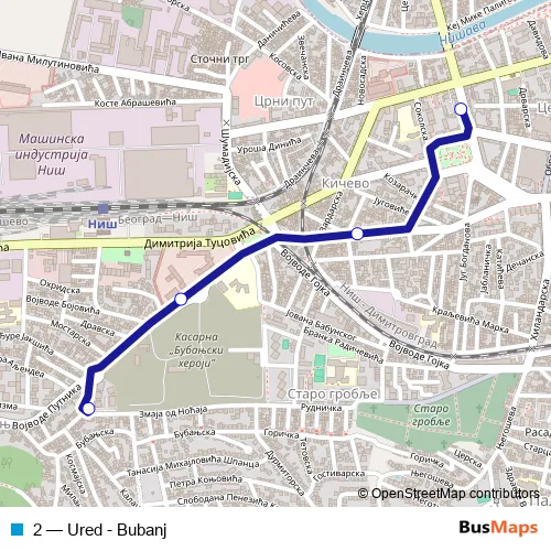 The first stop of the 2 bus route is Ured and the last stop is Bubanj (okretnica). 2 (Ured - Bubanj) is operational during everyday.