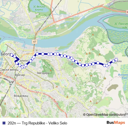The first stop of the 202n bus route is Trg Republike and the last stop is Veliko selo. 202n (Trg Republike - Veliko Selo) is operational during everyday.