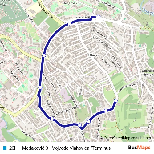 The first stop of the 26l bus route is Vojvode Vlahovića (terminus) and the last stop is Medaković 3. 26l (Medaković 3 - Vojvode Vlahovića /Terminus) is operational during everyday.