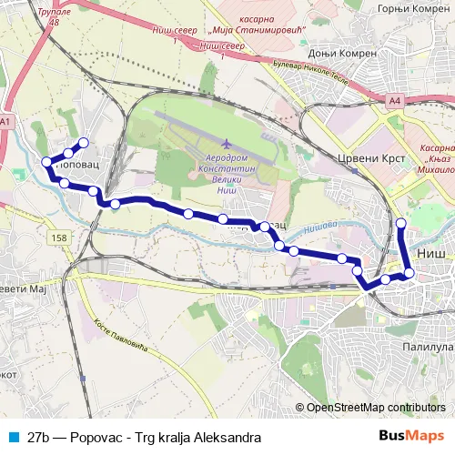 The first stop of the 27b bus route is Popovac - trafo and the last stop is Trg kralja Aleksandra. 27b (Popovac - Trg kralja Aleksandra) is operational during everyday.