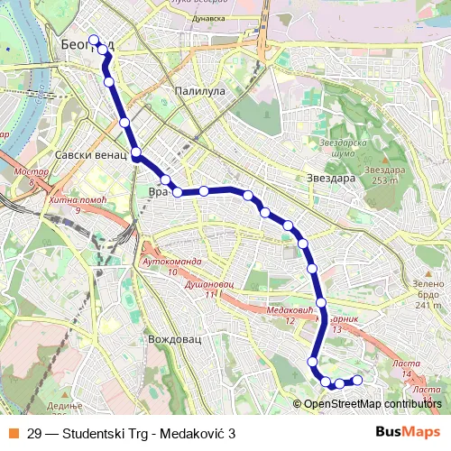 The first stop of the 29 trolleybus route is Studentski trg and the last stop is Medaković 3. 29 (Studentski Trg - Medaković 3) is operational during everyday.