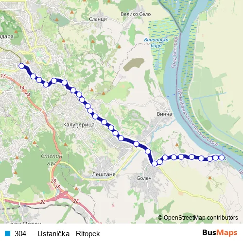 The first stop of the 304 bus route is Ustanička and the last stop is Ritopek. 304 (Ustanička - Ritopek) is operational during everyday.
