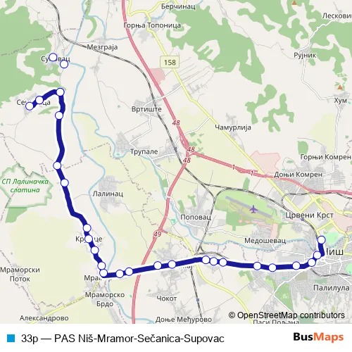 The first stop of the 33p bus route is PAS Niš ( iz Niša ) and the last stop is Supovac okretnica ( ka gradu). 33p (PAS Niš-Mramor-Sečanica-Supovac) is operational during everyday.