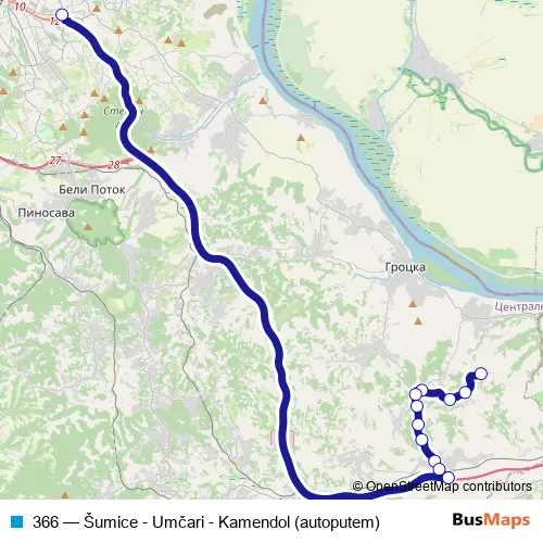 The first stop of the 366 bus route is Trajna jaruga - Okretnica and the last stop is Šumice. 366 (Šumice - Umčari - Kamendol (autoputem)) is operational during on weekdays.
